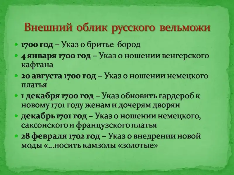 Коренные изменения коснулись и одежды. Слайд 27. Петр I подписал несколько указов, касающихся вопроса, как должен выглядеть, какое платье должен носить русский вельможа.
