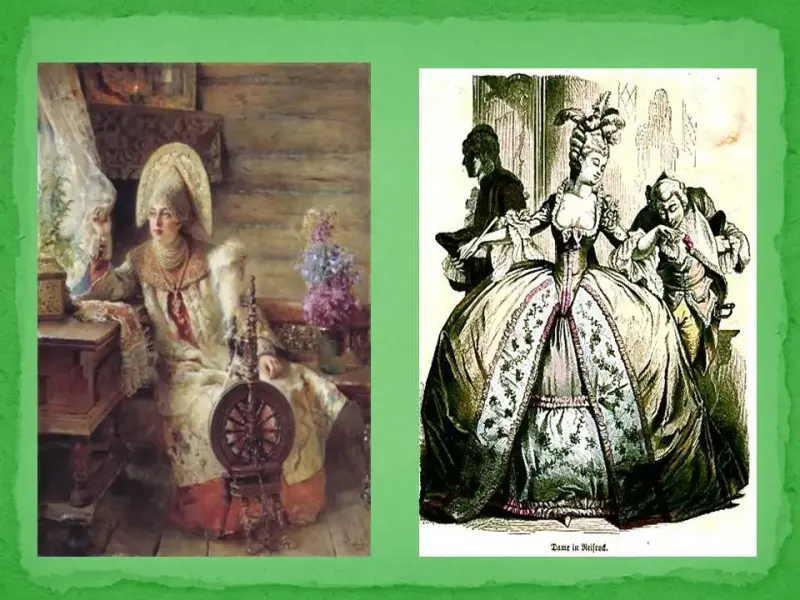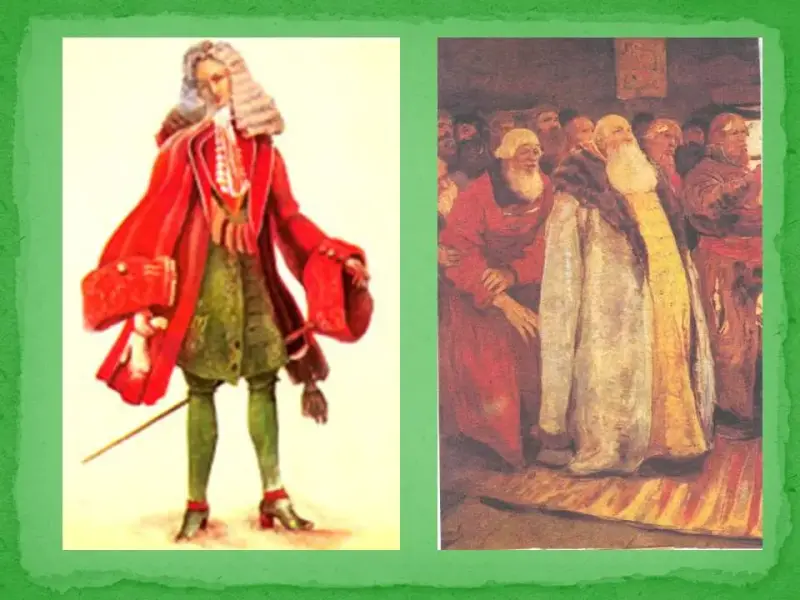 В чем их различие? (длиннополая, широкая шуба, длинная рубаха, ноги не видно, борода; приталенный кафтан, чулки, башмаки на каблуке, парик).