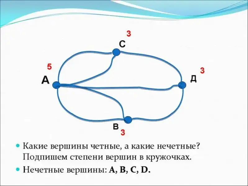 ВЫВОД. Так как количество нечетных вершин в графе равно 4, а это > 2, то обойти все Кенигсбергские мосты, проходя только один раз через каждый из этих мостов нельзя.