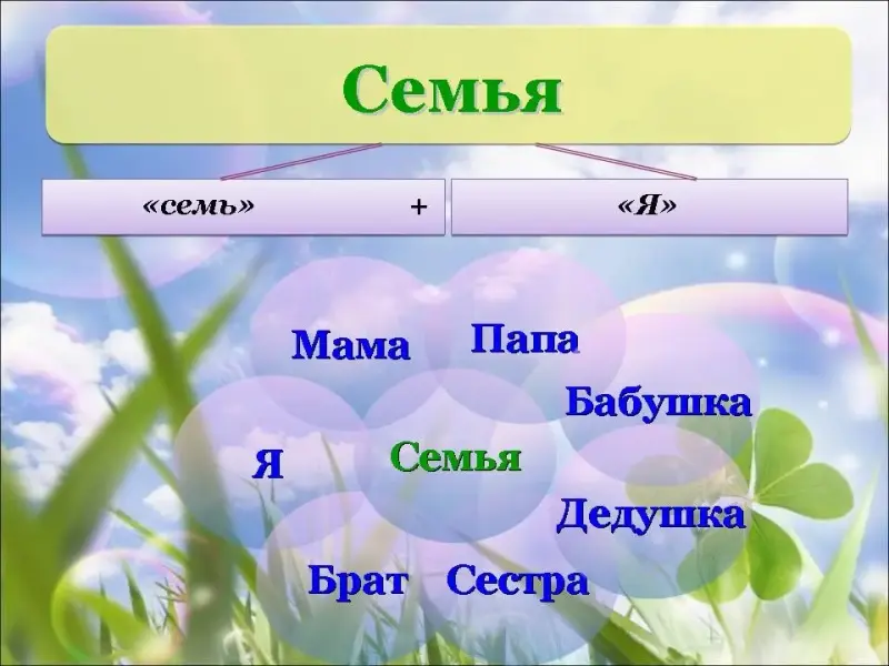 - Ты проживаешь в семье. Это слово состоит из двух слов "семь" + "Я". (Слайд 3)