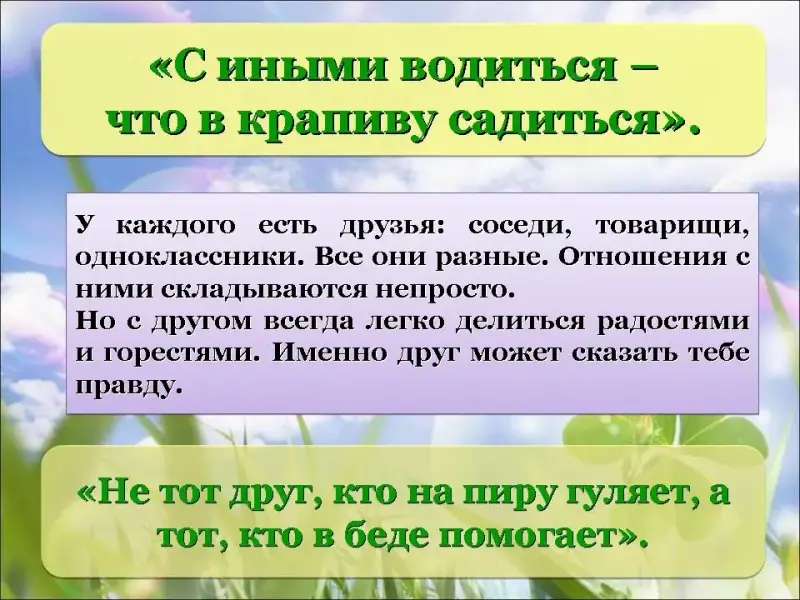 - Существует хорошая пословица "С иными водиться - что в крапиву садиться". У каждого есть друзья: соседи, товарищи, одноклассники. Все они разные. Отношения с ними складываются непросто.