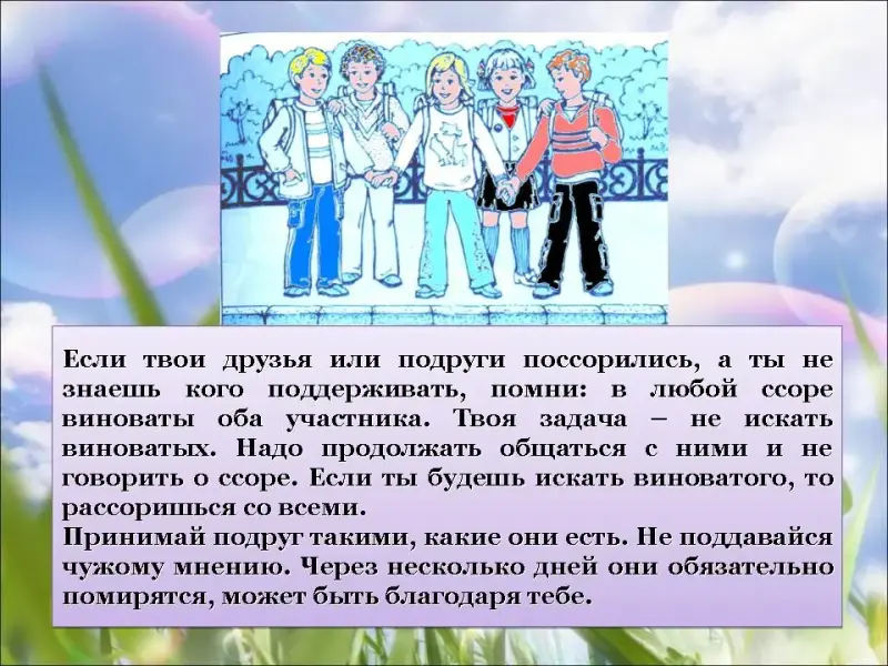 - Принимай подруг такими, какие они есть. Не поддавайся чужому мнению. Через несколько дней они обязательно помирятся, может быть благодаря тебе.