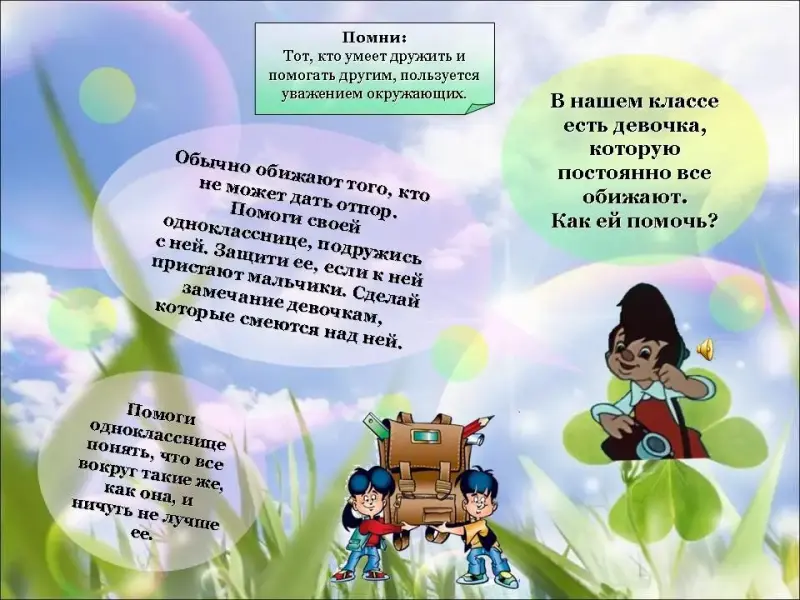 2. В нашем классе есть девочка, которую постоянно все обижают. Как ей помочь? (ответы детей, Слайд 18)