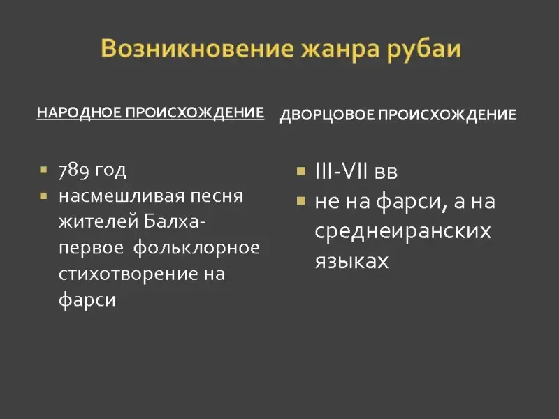 Опираясь на свой аналитический, острый ум, используя опыт народного литературного красноречия, Хайям создал удивительно гибкую жанровую форму, способную вмещать глубины философской мысли, злую эпиграмму, застольный куплет, любовную зарисовку.