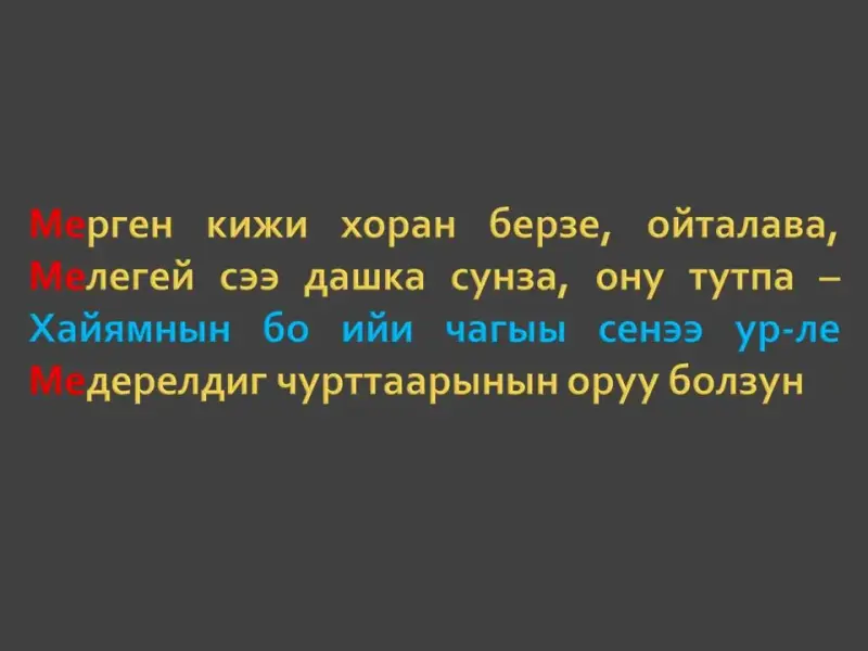 Заметим, что в тувинском стихе рифмуются начальные звуки первого слова строк.