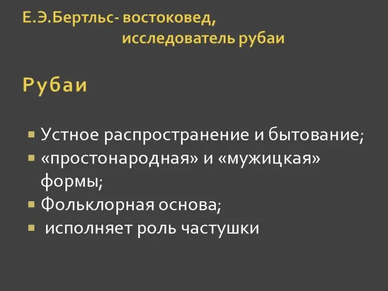 По наблюдениям Е.Э.Бертельса, востоковеда, исследователя [1] творчества поэта, рубаи имеют следующие черты:
