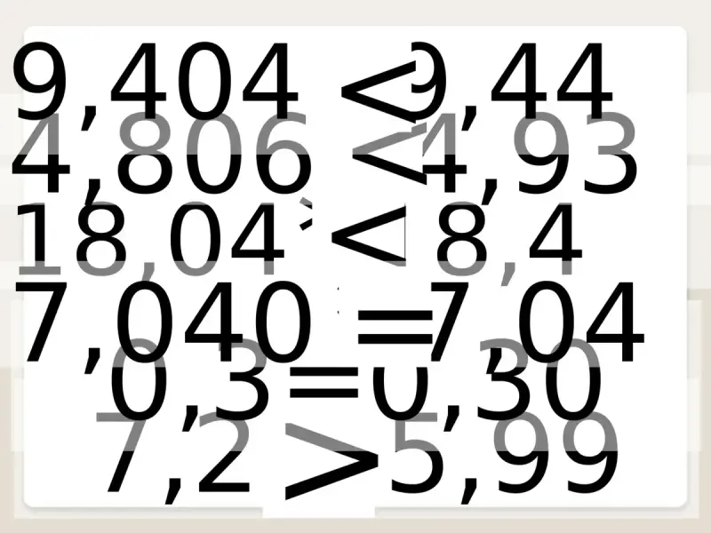 (Десятичные дроби сравнивают поразрядно, начиная со старшего разряда: целую часть с целой, десятые с десятыми, сотые с сотыми и т.д.)