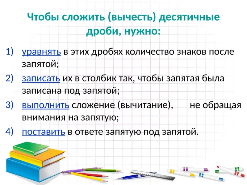Чтобы сложить (вычесть) десятичные дроби, нужно: