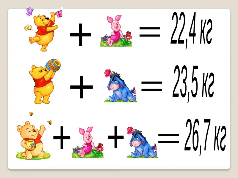 20 кг была повреждена, и показания на ней прочитать не представлялось возможным. Поэтому я взвесился, сначала с Пятачком: получилось 22,4 кг; затем с Осликом, получилось 23,5 кг; а затем мы взвесились все вместе и получили 26,7 кг. Но все равно мы так и не узнали свой вес. Если сможете, помогите нам, пожалуйста. Мы на вас надеемся. Мы слышали, что вы самые лучшие ученики в этой школе среди шестых классов. С большим уважением Винни Пух".