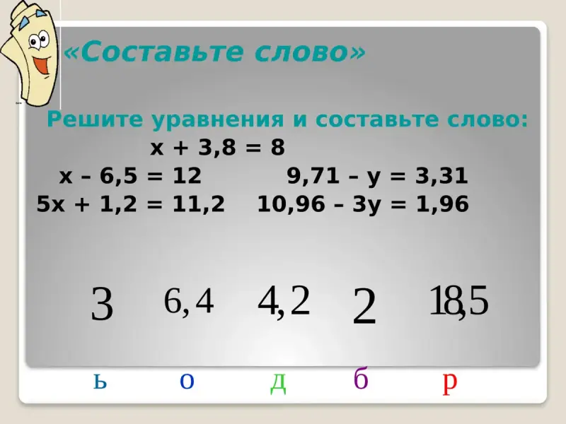 IV. Решение уравнений "Составьте слово" - 5 мин. (слайд 13)