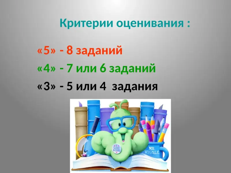 Критерии оценки:"5" - 8 заданий;"4" - 7 или 6 заданий;"3" - 5 или 4 задания.