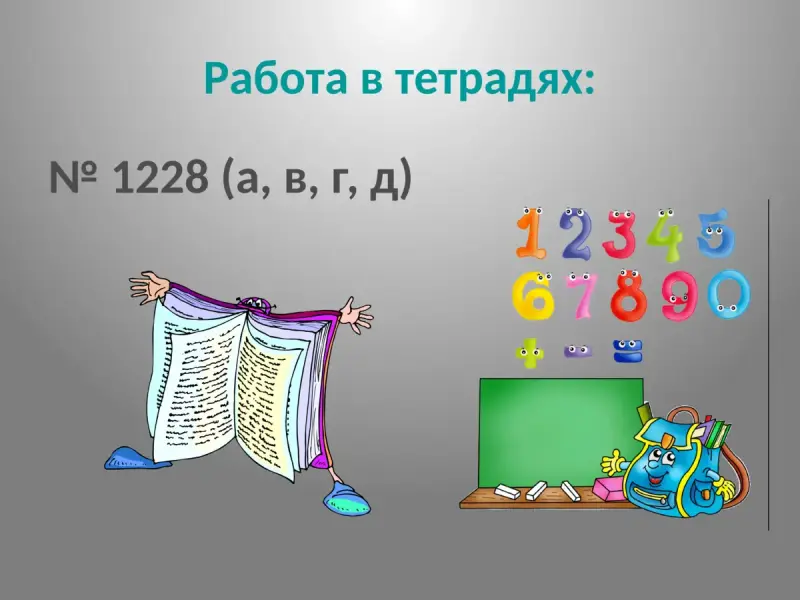 А теперь, ребята, самостоятельно работаем в парах. Выполняем № 1228 (а,в,г,д). (слайд 19). После выполнения номера меняемся тетрадями с соседом и проверяем правильность выполнения, сверяя с ответами на слайде. (слайд 20)