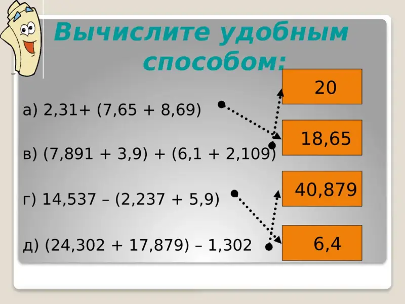 а) 2,31+ (7,65 + 8,69) = (2,31 + 8,69) + 7,65 = 11+7,65 = 18,65;