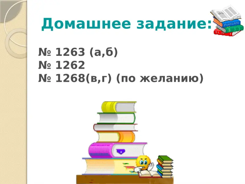 № 1263 (а,б), № 1262 - примеры и задача на сложение и вычитание десятичных дробей, № 1268(в,г) - более сложные уравнения, для тех кто испытывает интерес к изучению математики.