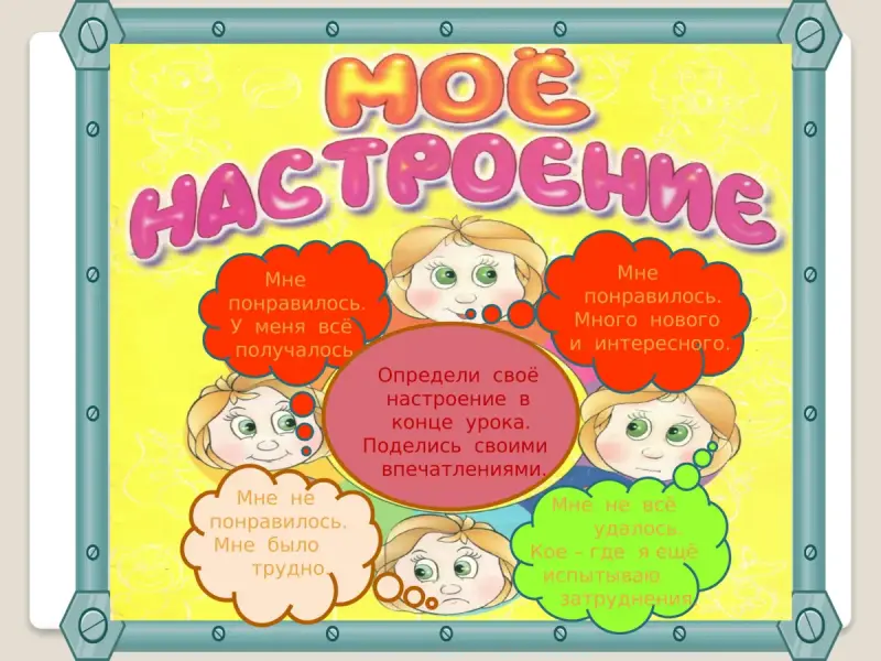 Учащиеся рассуждают о том, что им больше всего понравилось на уроке, что запомнилось, что бы они хотели повторить, что бы хотели изменить. Как они себя чувствовали на уроке.