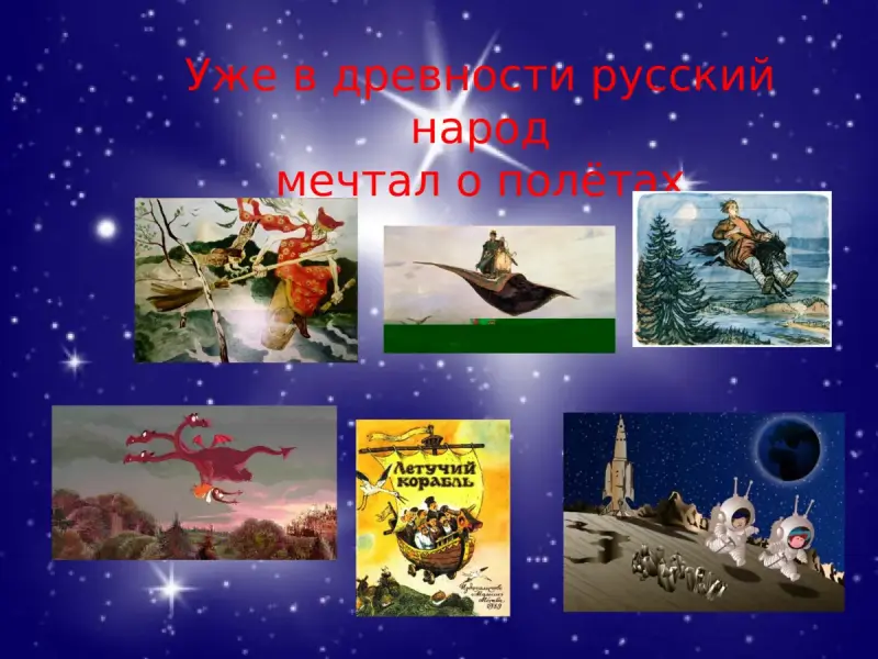 У - Человека издавна влекли к себе высокое небо, далёкие звёзды, загадочные дали космоса, вселенной. Уже в древности русский народ мечтал о полётах, и потому в сказках возникали образы героев, которые могли летать.