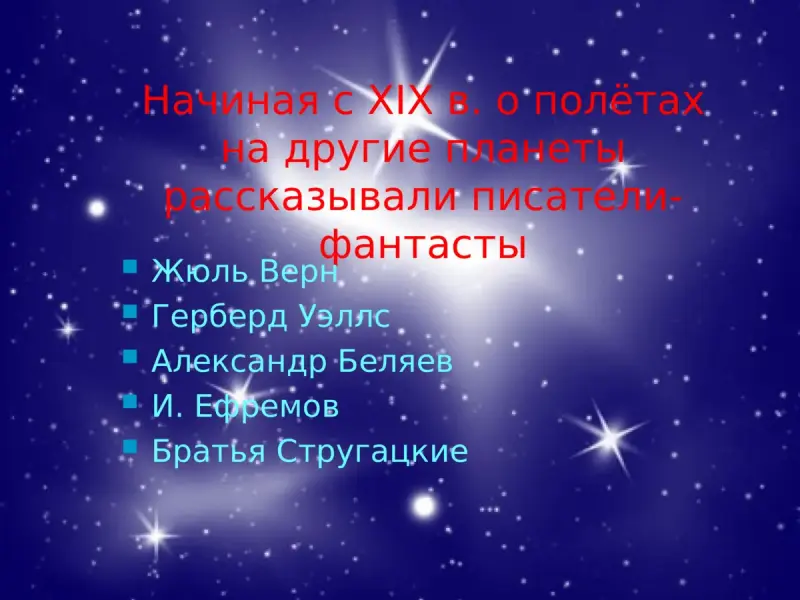 Начиная с ХIХ века о полётах на другие планеты, пришельцах из космоса, космических войнах рассказывали писатели-фантасты: Жюль Верн, Генрих Уэльс, Александр Беляев, братья Стругацкие и другие.