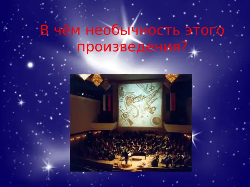 Д - Композитор соединил музыку с цветом, так появилась "цветомузыка". Музыка обладает яркими красками, динамичностью, острым ритмом, вызывает в воображении космические картины, образ бесстрашного Прометея.
