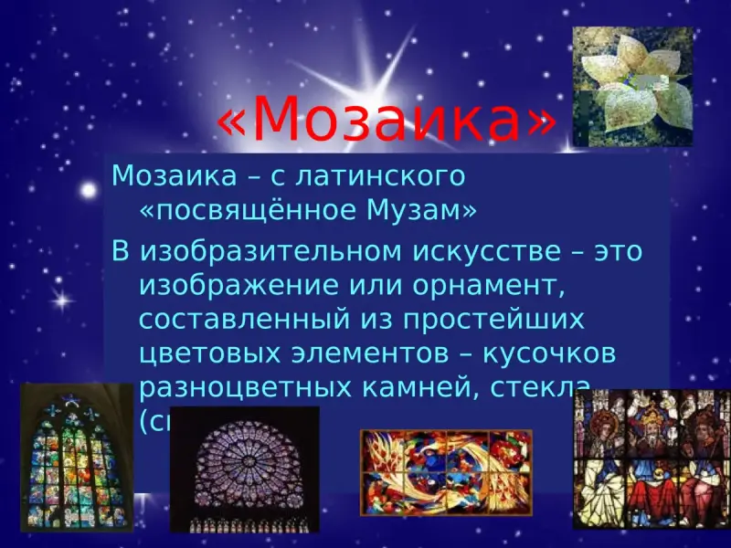 В изобразительном искусстве мозаика - это изображение или орнамент из простейших цветовых элементов - кусочков разноцветных натуральных камней, стекла (смальты).