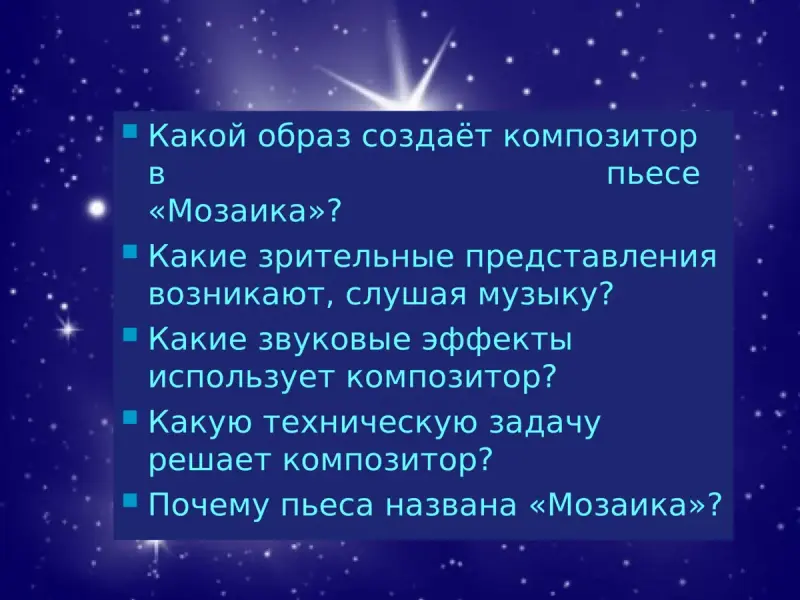 1. Какой образ создаёт композитор в пьесе "Мозаика"?