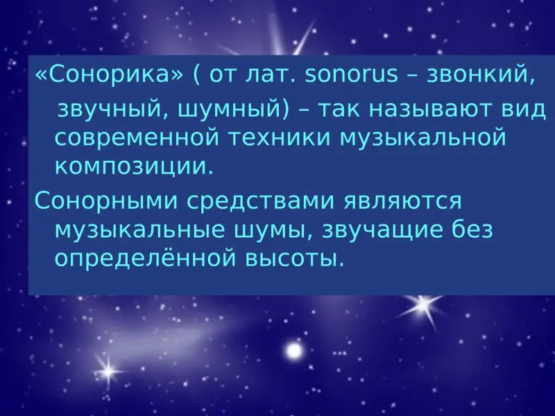 У - В музыке есть такое понятие как "сонорика" (от лат. sonorus - звонкий, звучный, шумный) - вид современной техники музыкальной композиции. Её специфика заключается в выдвижении на первый план окраски звучания. Таким образом, сонорными являются шумы, звукокрасочные интонации без определённой высоты.