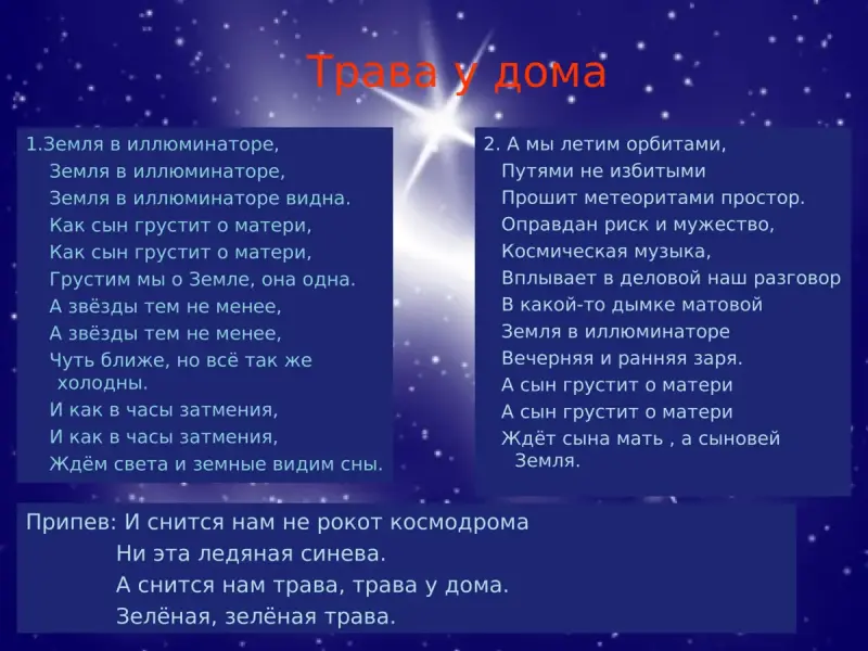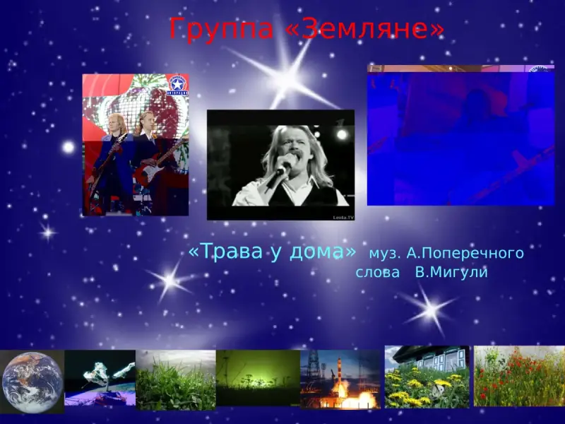 У - Завершим мы наш урок замечательной песней В.Мигули на слова поэта А.Поперечного "Трава у дома", которая была очень популярна в 80-е годы ХХ века, в исполнении группы "Земляне".