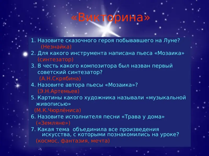• Сформировать у детей представление о космосе, через музыку А.Н.Скрябина, Э.Н.Артемьева, картины Чюрлёниса, поэзию русских поэтов.