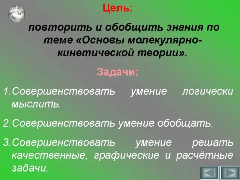 - Повторить, обобщить и систематизировать знания учащихся по теме «Основы молекулярно-кинетической теории»