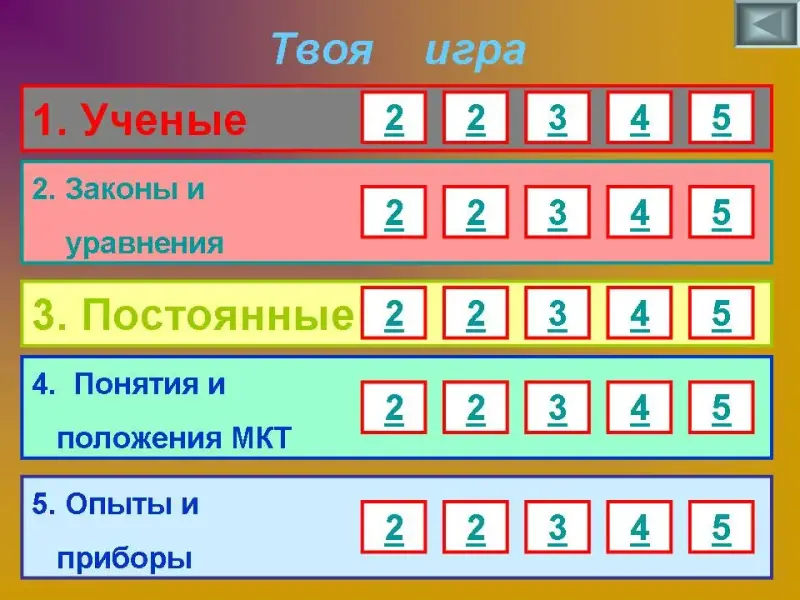 1 РАУНД - «ТВОЯ ИГРА» (25 вопросов на моментальный ответ) по мотиву популярной телевизионной игры «СВОЯ ИГРА» - 10 минут (количество баллов определено в табло игры). Переход к вопросам осуществляется по гиперссылкам, настроенным на цифры.
