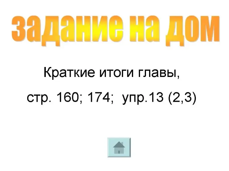 Задание на дом: краткие итоги главы, стр. 160, 174; упр. 13 (2, 3)