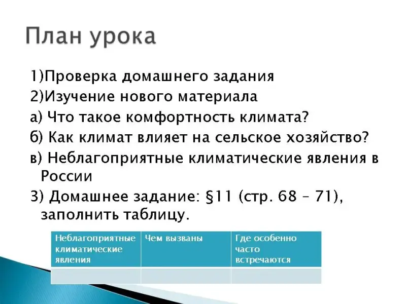 Цели и задачи урока: определить, что такое агроклиматические ресурсы, комфортность климата, какие стихийные явления, связаны с климатом; продолжить формировать умения работать с атласом, учебником, источниками дополнительной информации, анализировать материал, составлять таблицу; воспитывать любовь к своей стране и малой Родине, толерантность.