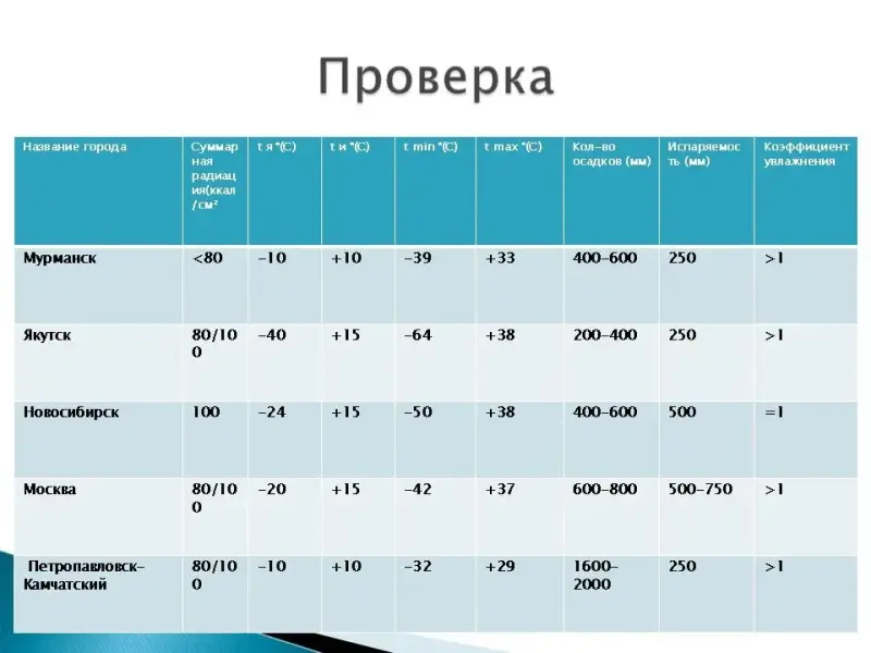 - используя климатические карты атласа, определите количество суммарной солнечной радиации, среднюю зимнюю, летнюю, максимальную и минимальную температуру воздуха; количество осадков, испаряемость, коэффициент увлажнения для городов: