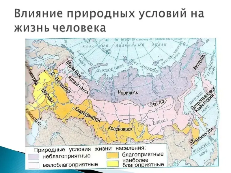 - Используя карту на доске "Влияние природных условий на жизнь человека", определите: