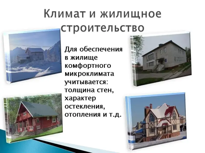 Климат обязательно учитывается в жилищном строительстве. Существует строительно-климатическое районирование территории России, где для каждого из районов определяются требования к жилищу: какова толщина стен, характер остекления, отопления и т.д. Для обеспечения в жилище комфортного микроклимата в разных районах необходима различная степень его изолированности от внешней среды. Например, на Крайнем Севере окна должны иметь тройное остекление, в домах должно быть мощное отопление и механическая приточная вентиляция (приток подогретого воздуха), естественная вытяжная. А на Черноморском побережье Кавказа летом жилище должно защищать только от дождя, а погода зимой позволяет держать в домах открытыми форточки. Понятно, что затраты на отопление домов на Крайнем Севере будут во много раз выше, чем в субтропиках Кавказа, и это требуется учитывать и планировать. Климатические условия влияют и на потребность в жилой площади, и на планировку квартир. Чем большую часть времени человек проводит в своей квартире, тем просторнее она должна быть. Так, на Крайнем Севере на одного жителя должно быть в полтора раза больше жилой площади, чем в средней полосе России, а число комнат должно быть на одну больше, чем количество членов семьи. В районах жаркого климата необходимы летние помещения: веранды, неостекленные террасы, а дома должны иметь сквозное проветривание.