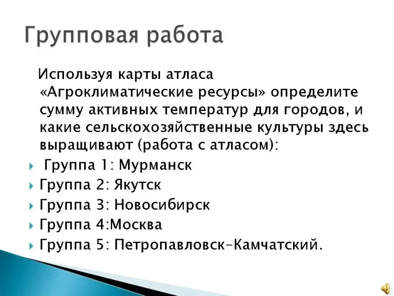 1. Групповая работа: Используя карты атласа "Агроклиматические ресурсы" определите сумму активных температур для городов, и какие сельскохозяйственные культуры здесь выращивают (работа с атласом):