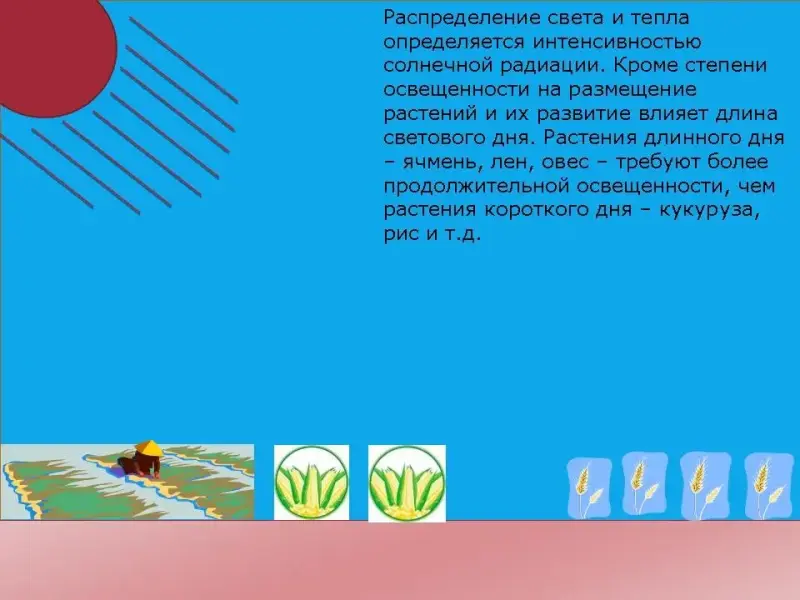 - Вывод по вопросу: агроклиматические ресурсы (свет, тепло, влага) определяют возможности выращивания тех или иных сельскохозяйственных культур, а человек решает, как воспользоваться этими возможностям.