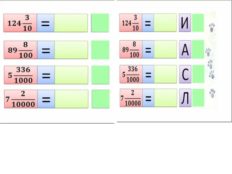 - научить учащихся читать и записывать десятичные дроби, переводить обыкновенные дроби со знаменателем 10, 100, 1000 и т.д. в десятичные и наоборот;