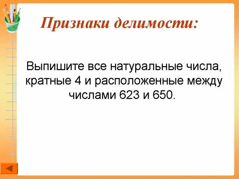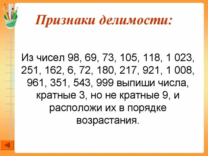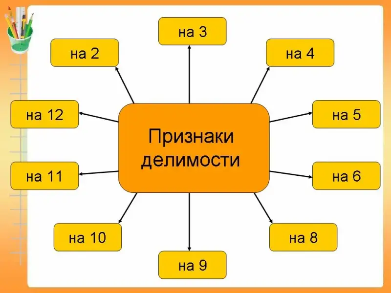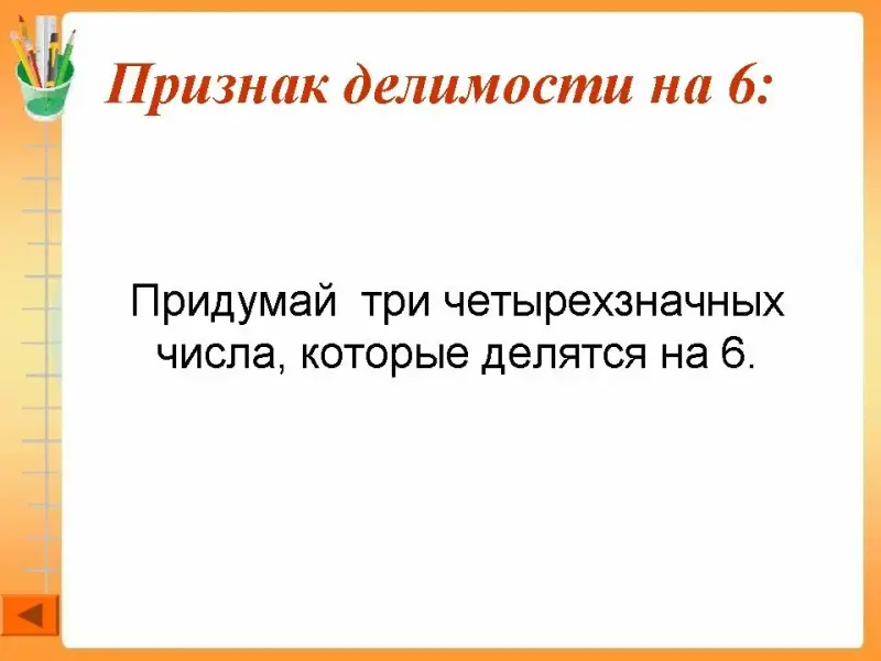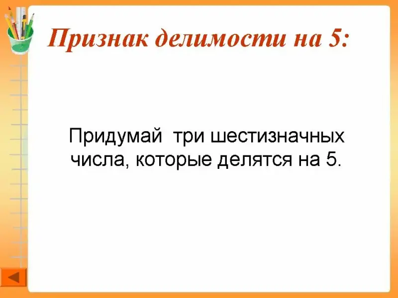 В конце презентации представлены несколько задач на различные признаки делимости. (Чтобы перейти к ним по ссылке нужно нажать на слова в центре слайда «Признаки делимости».)