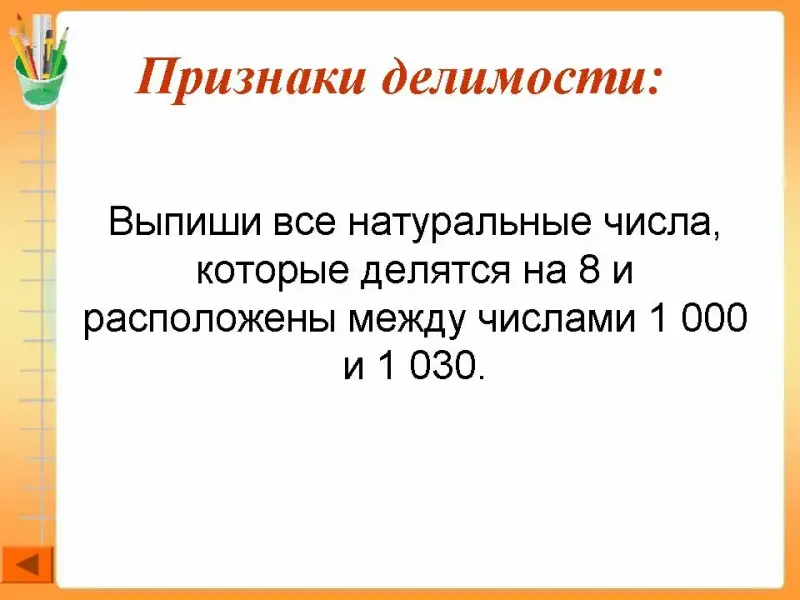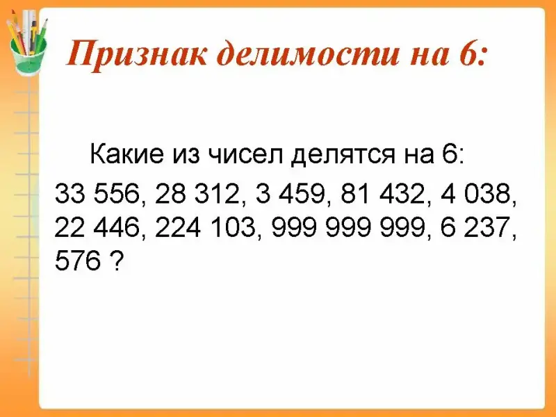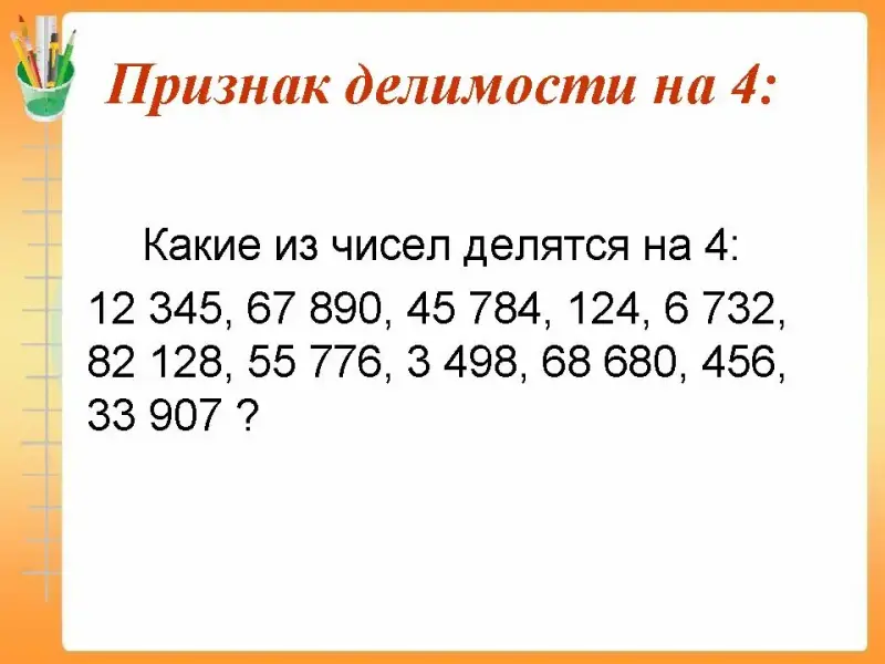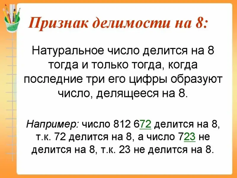 Натуральное число делится на 2 тогда и только тогда, когда последняя цифра в записи числа 0, 2, 4, 6 или 8.