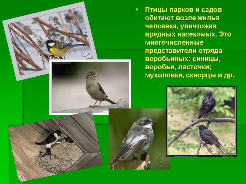 - Птицы парков и садов обитают возле жилья человека, уничтожая вредных насекомых. Это многочисленные представители отряда воробьиных: синицы, воробьи, ласточки, мухоловки, скворцы и др. Обычно это птицы мелких и средних размеров.
