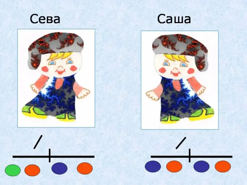 1. <Слайд 5> Сегодня к нам в гости пришли два мальчика. Одного из них зовут Саша, а другого Сева. Но вот беда - наши мальчики близнецы, они так похожи друг на друга, что невозможно понять кто из них Сева, а кто Саша. Узнать имена мальчиков нам помогут схемы, которые они держат в руках. Рассмотрите их, чем они отличаются? Какие согласные звуки в схеме мы обозначаем зелёным цветом? А какие синим? Определите, как зовут мальчика, имя которого начинается на твёрдый согласный звук. Определите, как зовут мальчика, имя которого начинается на мягкий согласный звук