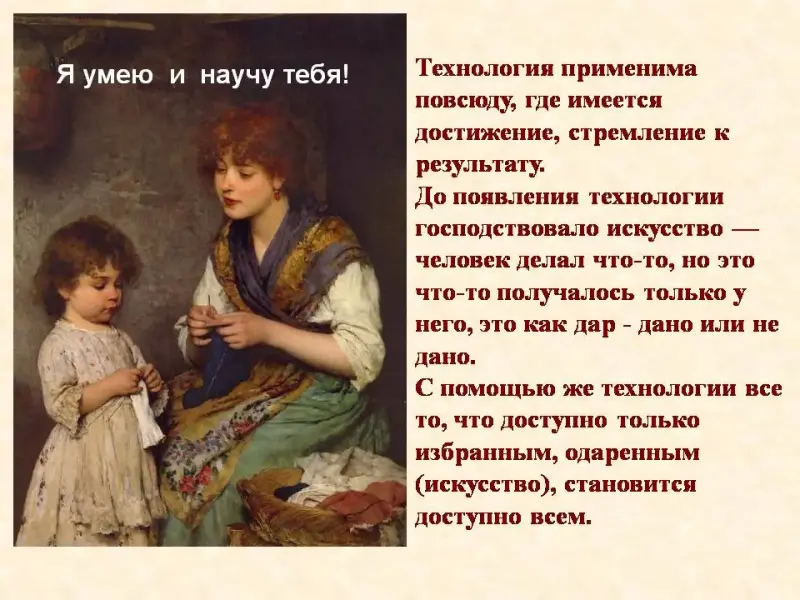 Слайд 6 Технология применима повсюду, где имеется достижение, стремление к результату. До появления технологии господствовало искусство - человек делал что-то, но это что-то получалось только у него, это как дар - дано или не дано. С помощью же технологии все то, что доступно только избранным, одаренным (искусство), становится доступно всем. Чтобы стать разносторонне подготовленными людьми, уметь добиться в жизни намеченных целей, нужно многое знать и уметь, в том числе овладеть самыми необходимыми технологическими навыками. На уроках технологии вы научитесь готовить вкусную и полезную пищу, овладеете различными способами обработки материалов, научитесь работать на швейной машине, приобретете навыки ухода за одеждой, предметами быта, освоите различные виды рукоделия: вышивку, вязание, лоскутную пластику. Я умею и научу тебя! Вы также сможете сказать, изучив основы нового предмета своим младшим сестренкам, подругам!