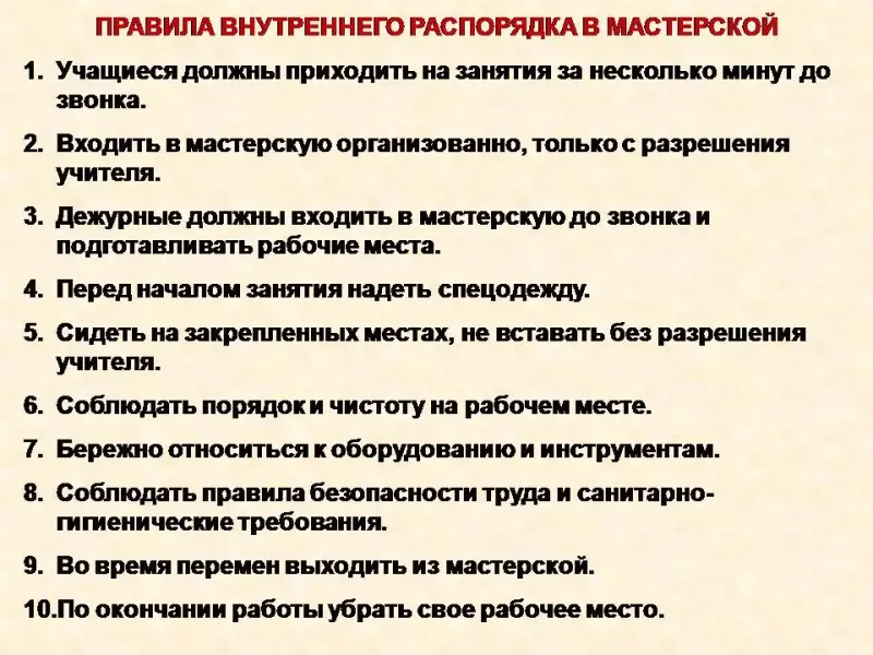 - Скажите, чем отличается этот кабинет от других в школе? В мастерской не просто столы, это специальная мебель для швейной мастерской, много швейных машин, гладильная доска с утюгом, специальные инструменты и приспособления для изготовления различных изделий. Слайд 10 Работа в данном кабинете требует соблюдения определенных правил - правил внутреннего распорядка в мастерской. Вы должны не только знать эти правила, но неукоснительно их соблюдать!