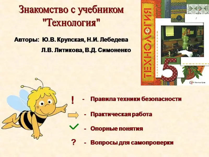 Слайд 11 Откройте его. Прочитайте, кто является автором. Авторы: Ю.В. Крупская, Н.И. Лебедева,Л.В. Литикова, В.Д. Симоненко. Видите, сколько людей трудились над созданием данного учебника, чтобы вам интересно было учиться. В начале учебника вы прочитайте обращение авторов учебника к школьницам 5 класса. Внизу, под обращением стоят какие-то интересные знаки. Это не простые знаки - это специальные обозначения.Эти обозначения находятся в каждом параграфе в конце или в середине, они помогают проверить свои знания и лучше подготовиться к уроку. Полистайте учебник и найдите эти обозначения в параграфе 2, параграфе 7. Молодцы!В конце учебника на стр. 188 находится «Содержание», где указаны все разделы, темы и параграфы. Посмотрите, чем мы будем заниматься в 5 классе, прочитайте названия основных разделов, они выделены другим шрифтом. Видите, сколько нового вам предстоит узнать. В 5 классе вы будете учиться вышивать, шить, готовить пищу и многое другое. Помимо учебника вам будут помогать специальные книги, которые находятся в библиотеке мастерской, энциклопедии в школьной библиотеке, специальные сайты в интернете, список которых вы видите на стенде учащихся. За каждой из вас в мастерской будет закреплено рабочее место. Откройте в учебнике стр. 15. Прочитайте, что называется рабочим местом.
