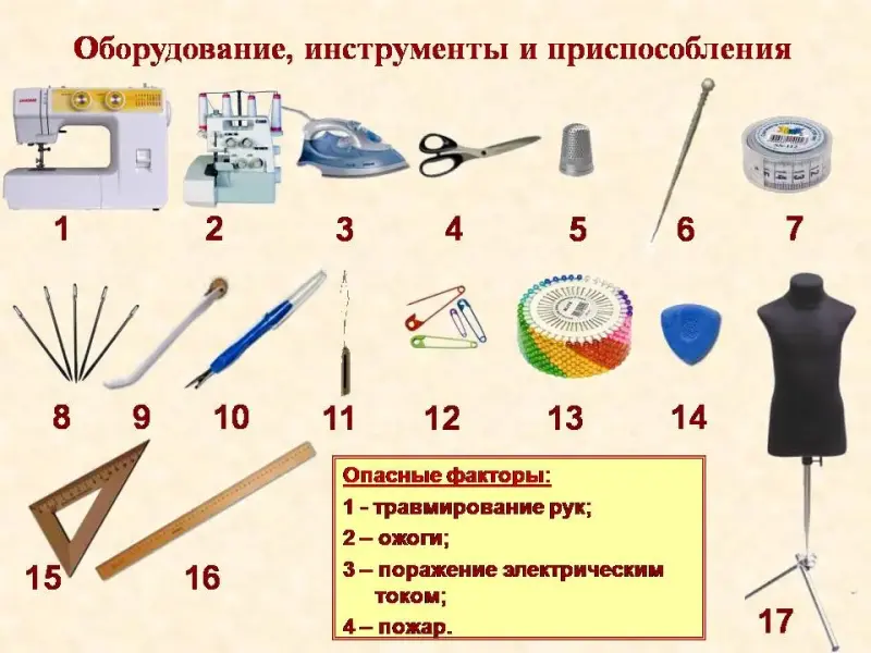 Слайд 12 У вас на столах лежат инструменты и приспособления, а на специальных столах стоит швейное оборудование. Они также будут вашими помощниками при изготовлении различных изделий. Постарайтесь определить самостоятельно для чего они предназначены. Многие вам незнакомы?