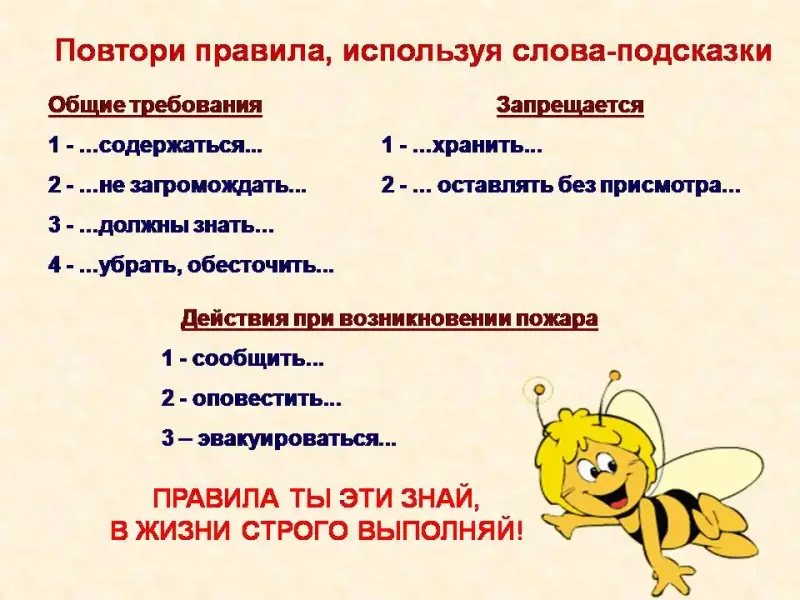 Слайд 18 Проверим ваши знания инструкции по пожарной безопасности. Задание «Повтори правила, используя слова-подсказки». «Правила ты эти знай, в жизни строго выполняй!» - этот совет дает нам пчелка Майя! Проверим, кто ответил правильно, без ошибок. Получите призовой жетончик, кто справился с заданием, он вам пригодится в конце занятия. Будьте внимательны, старайтесь запоминать более точно правила безопасности. Эти правила пригодятся вам в жизни, помогут спасти свою жизнь и жизнь окружающих людей. А если случится пожар, не нужно паниковать!