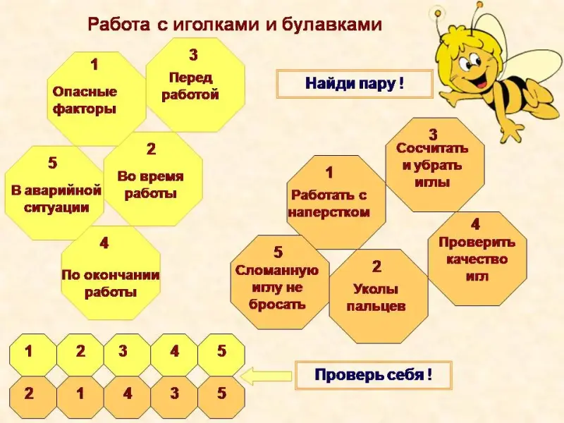 Слайд 21 Проверим знания инструкции по охране труда при работе с иголками и булавками. Игра «Найди пару».