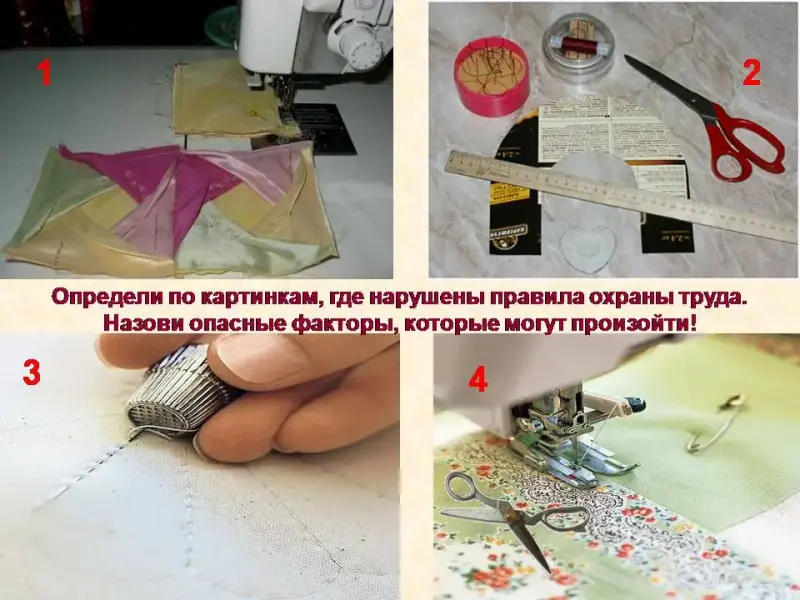 На стр. 16 учебника прочитайте, что называют инструментом, а что приспособлением. Определите самостоятельно согласно правилу в учебнике.Повторим! Когда я буду говорить «инструмент», а вы будете поднимать только инструменты, а когда «приспособления», то только приспособления. Если забудете название, посмотрите в учебнике на стр.16 - 20. Молодцы! Уже все запомнили. Чтобы удобнее было работать, необходимо правильно подготовить рабочее место к работе, разложить инструмент. Попробуйте разложить инструменты и приспособления самостоятельно, как вам удобно. Посмотрите! Многие положили ножницы перед собой, не подумали, какой рукой вы будете их брать, а ведь это основной инструмент при швейных работах. Неправильная организация рабочего места нарушает правила охраны труда! Охрана труда в нашей стране является одним из важнейших элементов организации производства и заключается в системе разнообразных мероприятий, направленных на формирование безопасных и здоровых условий труда. Вопросами безопасности труда занимаются лица, работающие в этой области, а также ученые, научные учреждения, научно-технические общества, профессиональные союзы и вся общественность. Охрана труда- это целая система обеспечения безопасности жизни и здоровья работников в процессе трудовой деятельности.