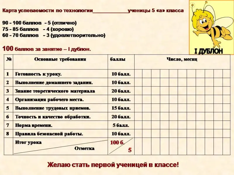 Слайд 30 На занятиях технологии нам понадобится «Карта успеваемости», которая лежит у вас на столе, подпишите ее. Дома вы вклеите в свою рабочую тетрадь. Оценка за занятие будет складываться за выполнение основных требований к уроку. Посмотрите на экран, сколько нужно получить баллов, чтобы получить пятерку! А если за занятие вы сможете набрать сто баллов, то получите «Дублон пчелки Майи» за старание. Дублоны вы сможете использовать перед каникулами на специальной ярмарке-распродаже. Дублоны - это специальные деньги, которые позволят купить красивые лоскутки ткани, картинки с кукольными платьями и даже готовые платья для куклы Барби, которые сошьют девочки старшеклассницы на занятиях профессиональной подготовки - будущие швеи. В дальнейшем вы научитесь самостоятельно оценивать свои знания и умения! Старайтесь и набирайте побольше дублонов!