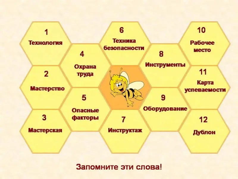 - У вас на столах лежат листочки с сотами. Верхняя часть - желтые соты с номерами, а нижняя часть - оранжевая, без номеров. Вы должны внимательно прочитать надписи на оранжевых сотах, соотнести их с желтыми сотами и написать номера соответствий. Приступайте к работе! - Проверим ваши ответы! Поменяйтесь листочками с соседом. На экране появятся правильные ответы. Проверяя, зачеркивайте неправильные.